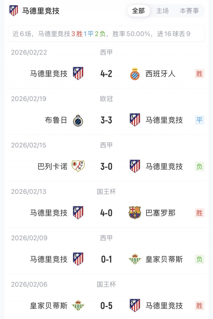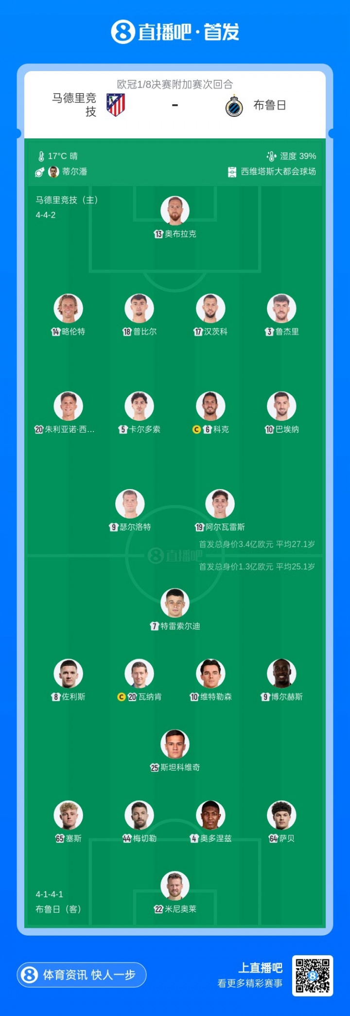 2月25日讯 欧冠1/8决赛附加赛次回合,马竞对阵布鲁日,赛前首发公布。