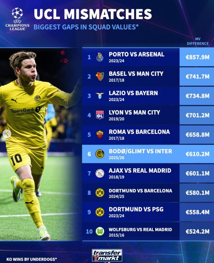 2月25日讯 国米在本轮欧冠主场1-2不敌博德闪耀,两回合总比分2-5被双杀,德转数据统计显示,两队身价相差6.1亿欧元,这也是欧冠以弱胜强的第6大身价差。