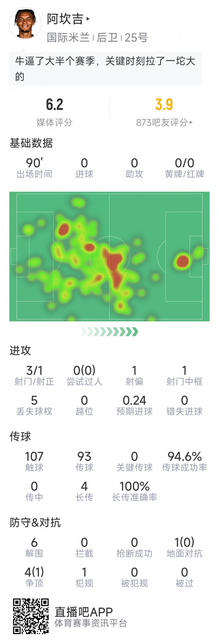 2月25日讯 在欧冠淘汰赛附加赛次回合,国米1-2不敌博德闪耀,阿坎吉首发出场,以下为他在本场数据: