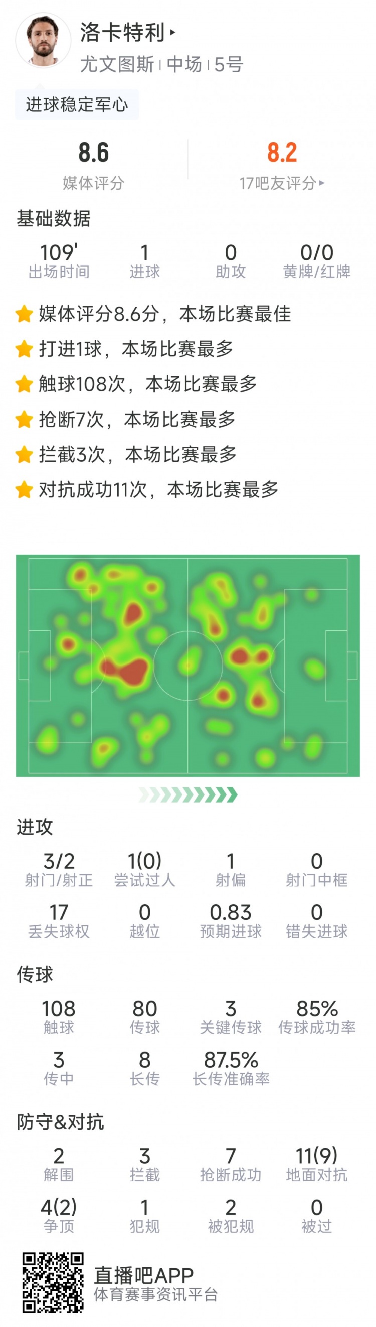 2月26日讯 在本轮欧冠淘汰赛附加赛,尤文3-2击败加拉塔萨雷,以下为洛卡特利本场数据: