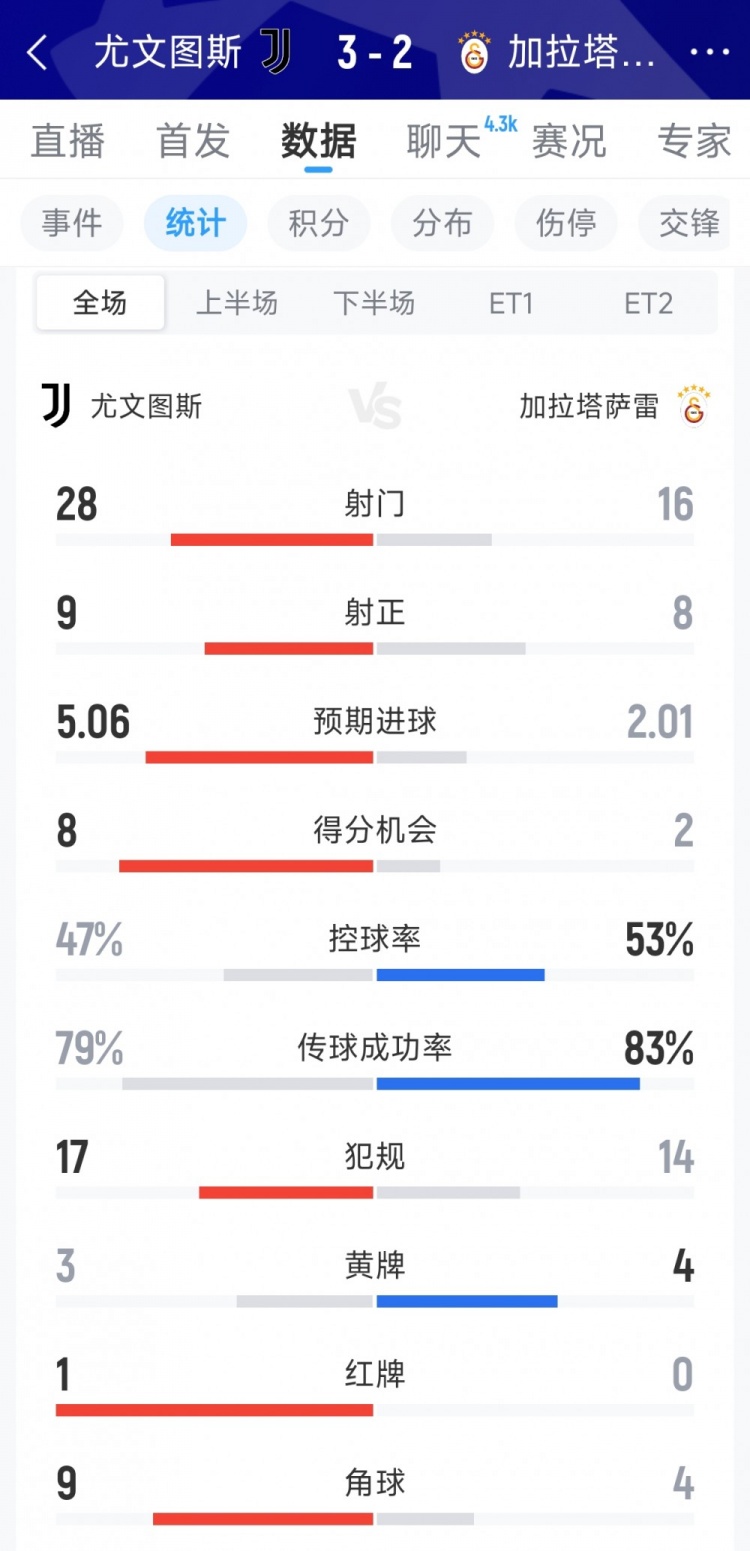 功亏一篑,尤文3-2加拉塔萨雷120分钟数据:射门29-16,射正 9-8