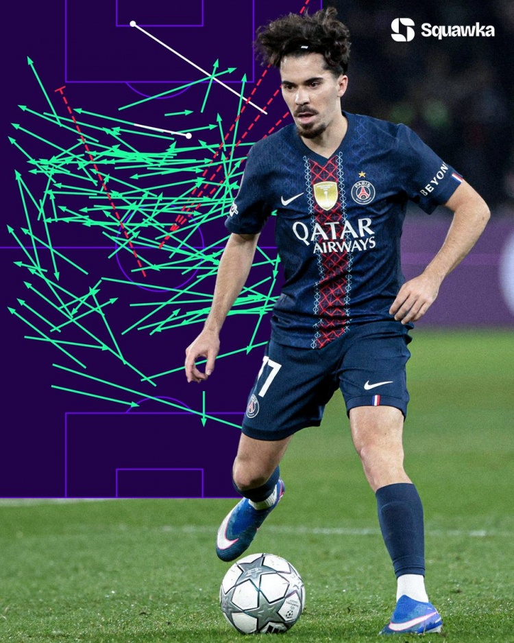 据Squawka统计,维蒂尼亚本赛季至今参加10场欧冠比赛,其中7场成功传球达到100次。