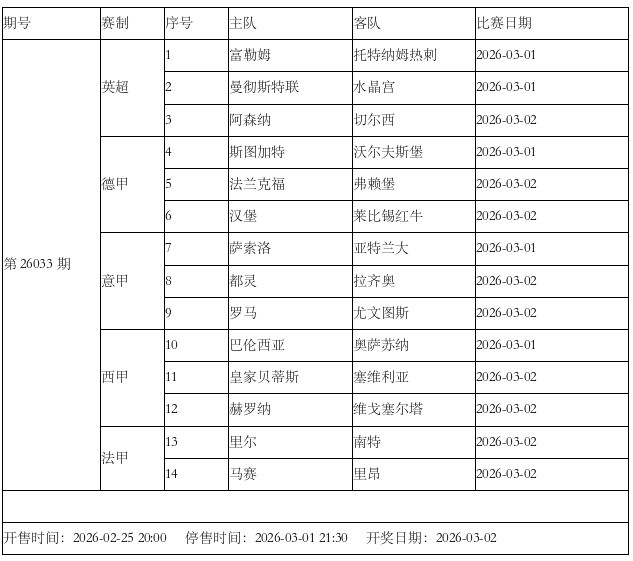 周日传足胜负彩游戏26033期竞猜对阵不乏强强对话,其中英超迎来阿森纳与切尔西的伦敦德比,意甲两大豪强罗马与尤文图斯将展开激战。其他还有热刺客场德比对阵富勒姆,曼联主场迎战水晶宫。