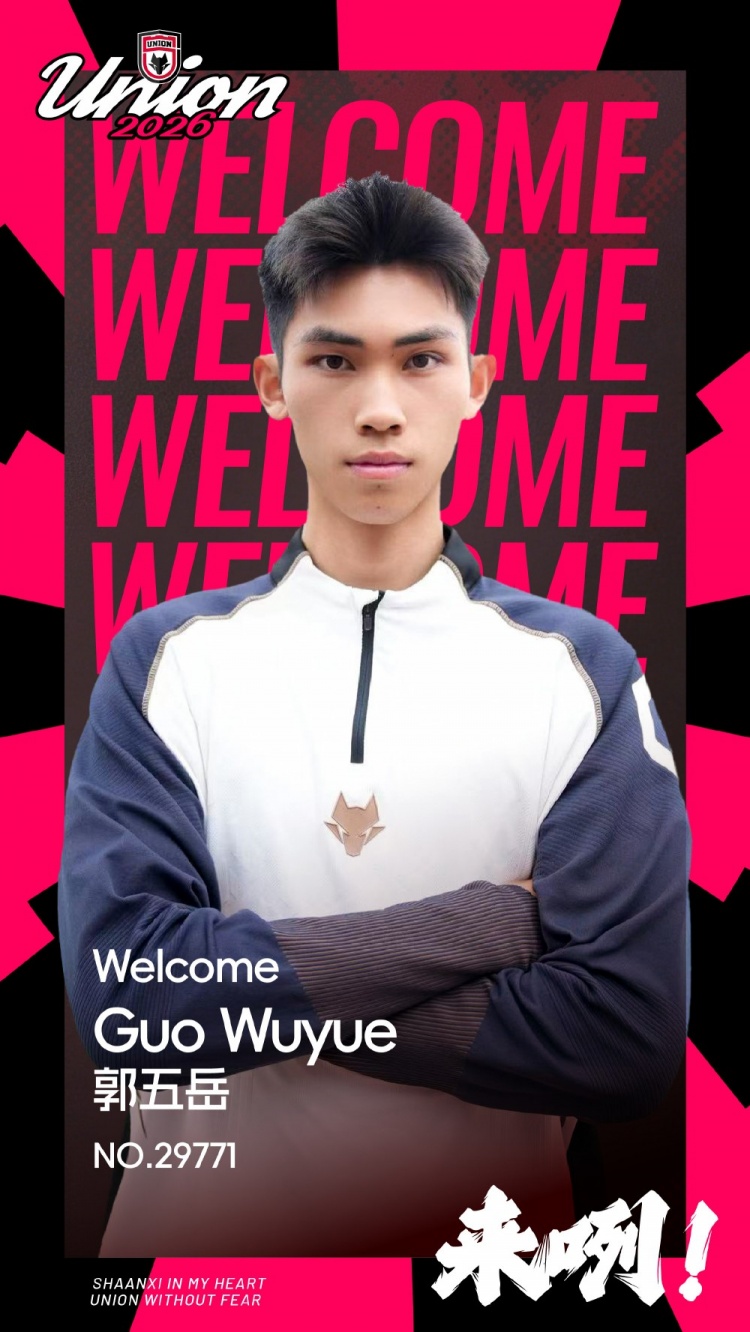 根据俱乐部长期发展规划,经与球员本人友好协商并达成一致,同时经俱乐部技术总监埃德温・彼得森先生完成技术评估与确认:球员郭五岳(会员号:29771)正式加盟陕西联合足球俱乐部!