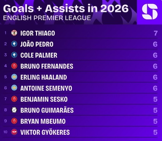进入2026年,伊戈尔·蒂亚戈在英超中已直接参与7球,位居所有球员之首。位居他身后的是若昂·佩德罗、帕尔默、B费、哈兰德以及塞梅尼奥的6球,舍什科、吉马良斯、姆伯莫和约克雷斯的参与进球数则为5球。