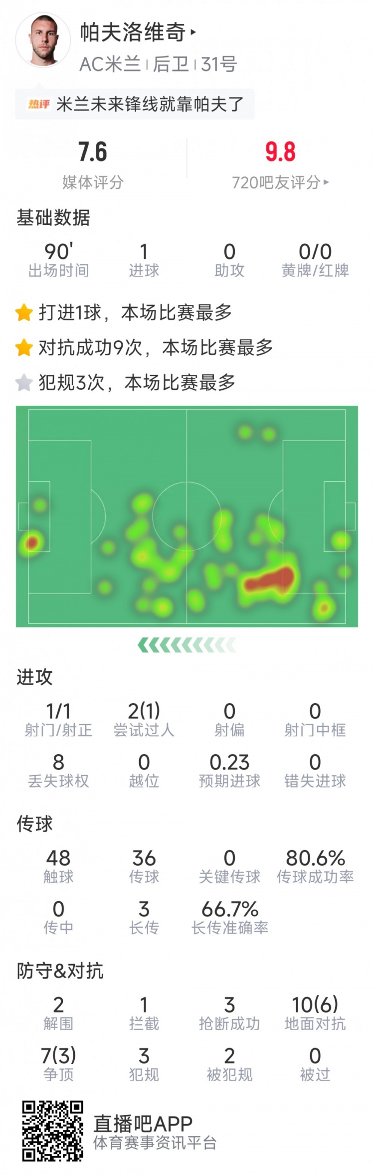 3月1日讯 在本轮意甲,AC米兰2-0击败克雷莫内塞,帕夫洛维奇打进关键进球,以下为他在本场数据: