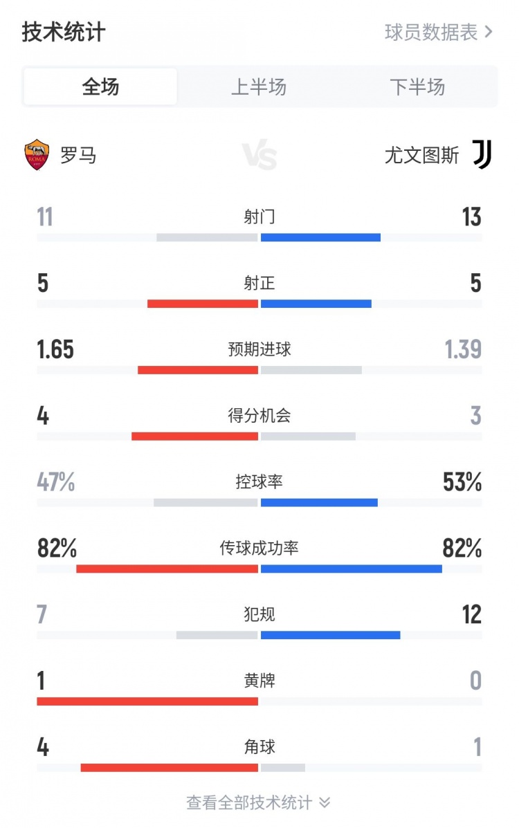 平分秋色!罗马3-3尤文全场数据:射门11比13,得分机会4比3