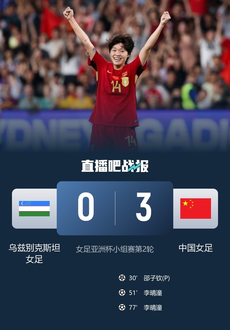 3月6日讯 女足亚洲杯小组赛第2轮,中国女足3-0击败乌兹别克斯坦女足,末轮将和朝鲜女足争夺小组头名。