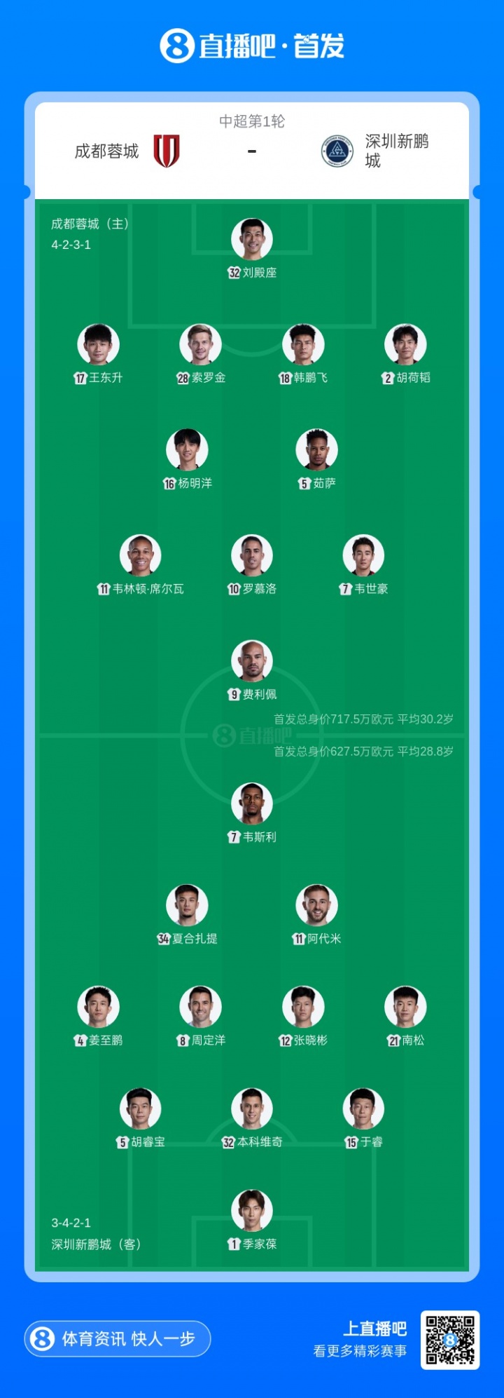 中超揭幕战|蓉城vs新鹏城:周定洋战旧主!韦世豪、夏合扎提先发