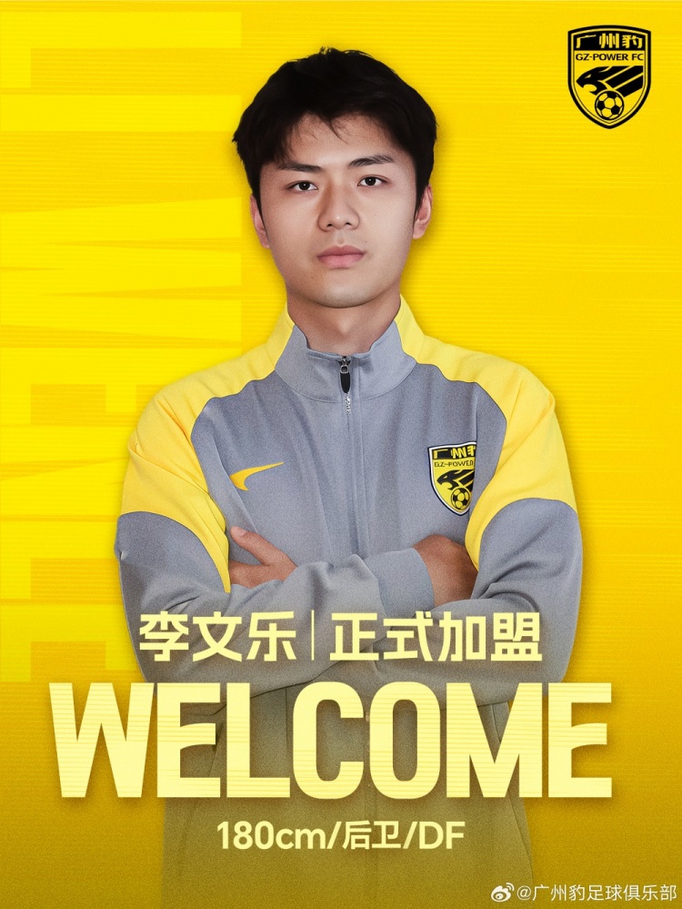 经与浙江职业足球俱乐部及球员本人协商并达成一致,潜力后卫李文乐正式加盟广州豹足球俱乐部。