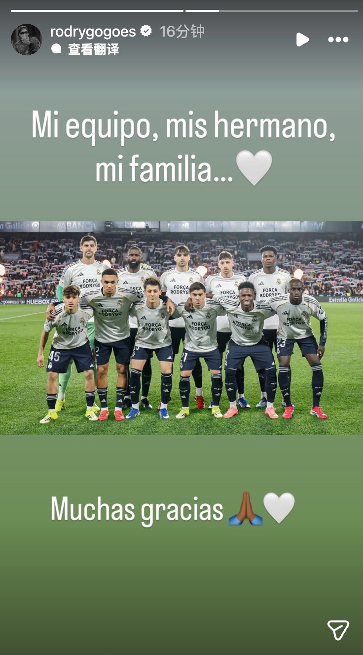 罗德里戈写道:我的球队,我的兄弟,我的家人,非常感谢。