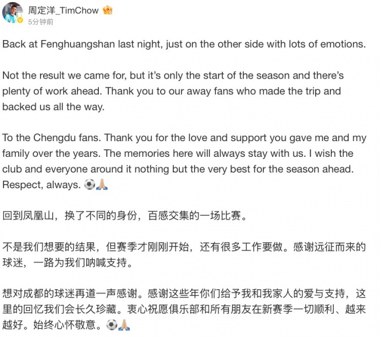 想对成都的球迷再道一声感谢。感谢这些年你们给予我和我家人的爱与支持,这里的回忆我们会长久珍藏。衷心祝愿俱乐部和所有朋友在新赛季一切顺利、越来越好。始终心怀敬意。