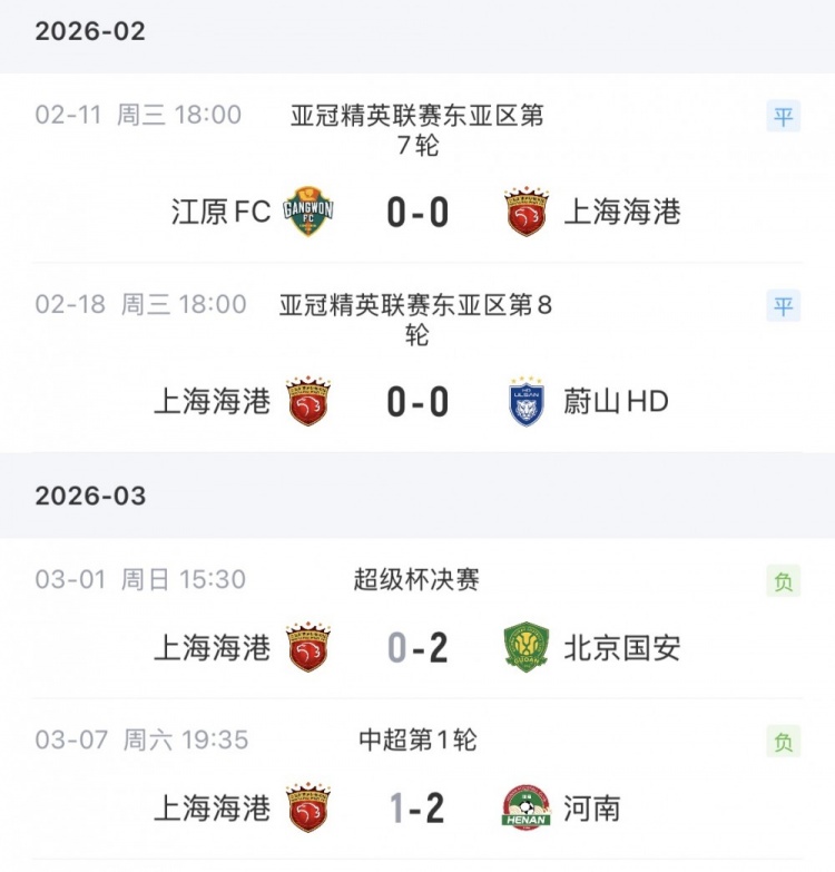 在2月中旬进行的亚冠精英联赛东亚区最后两轮赛事中,海港分别0-0战平江原FC和蔚山HD。上周的超级杯,海港0-2不敌国安。