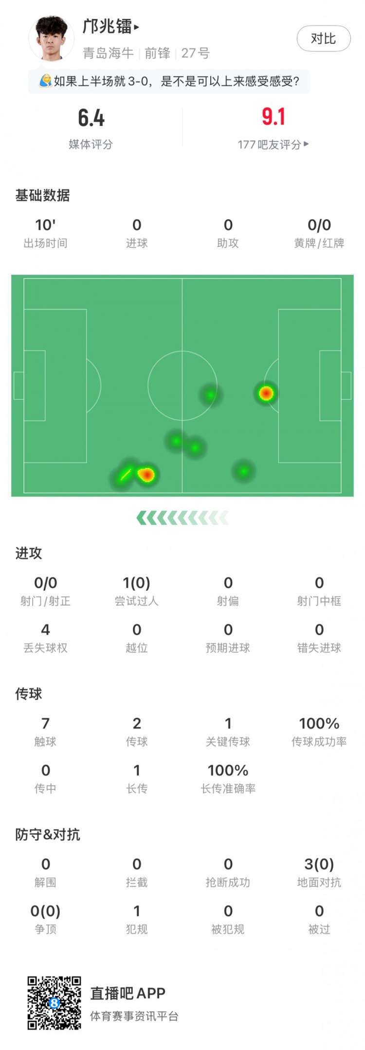 3月7日讯 中超首轮,青岛海牛1-3不敌云南玉昆,16岁邝兆镭替补登场上演中超首秀,他出战10分钟,获评6.4分。