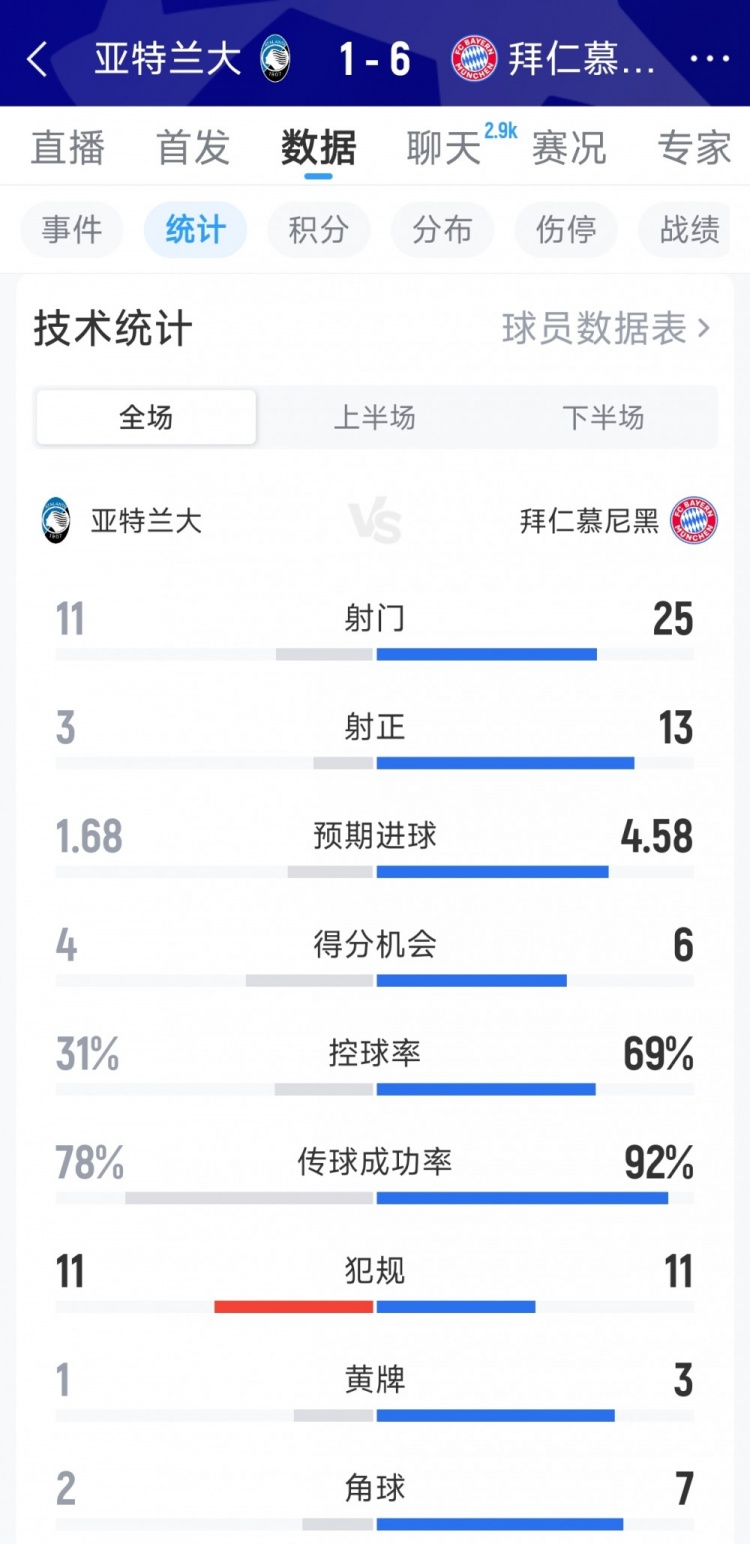 3月11日讯 在本轮欧冠淘汰赛,拜仁6-1击败亚特兰大,以下为双方全场数据对比: