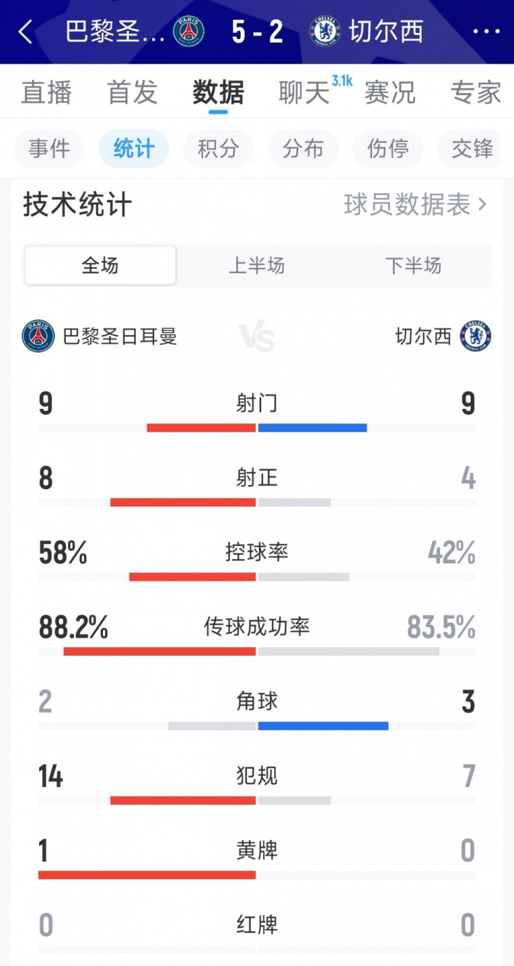 进攻大战!巴黎5-2切尔西全场数据:射门9-9,射正8-4