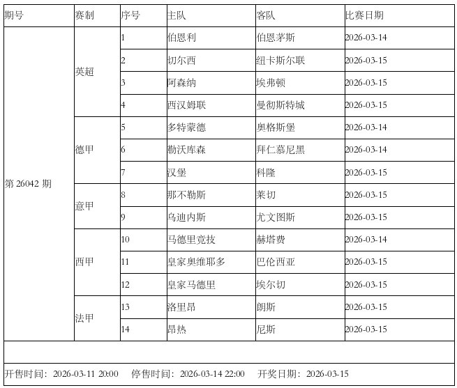 本周六,欧洲主流联赛继续进行,传足胜负彩第26042期竞猜赛事以英德意西法顶级联赛组成。英超方面,切尔西主场迎战纽卡斯,阿森纳则与埃弗顿展开交锋;德甲赛场,勒沃库森主场迎战拜仁;西甲,皇马主场迎来埃尔切挑战。