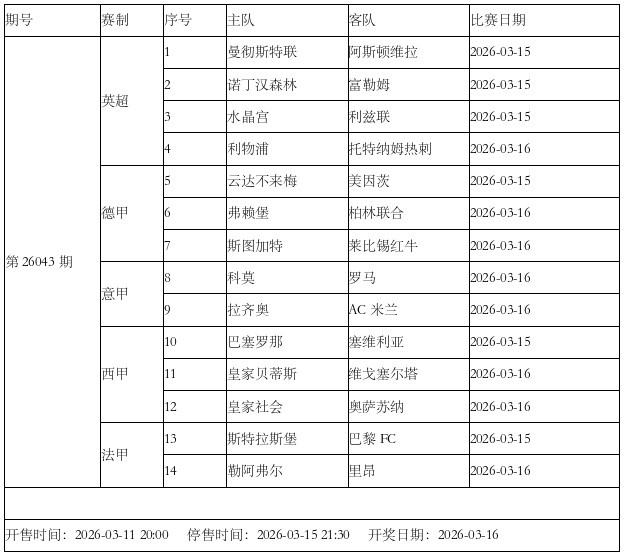 周日传足胜负彩26043期的竞猜对阵赛程中看点不少。其中,英超方面,曼联主场对阵维拉,欧冠双双失利的利物浦和热刺展开交战,意甲方面,AC米兰做客拉齐奥,西甲,巴萨则主场面对塞维利亚。