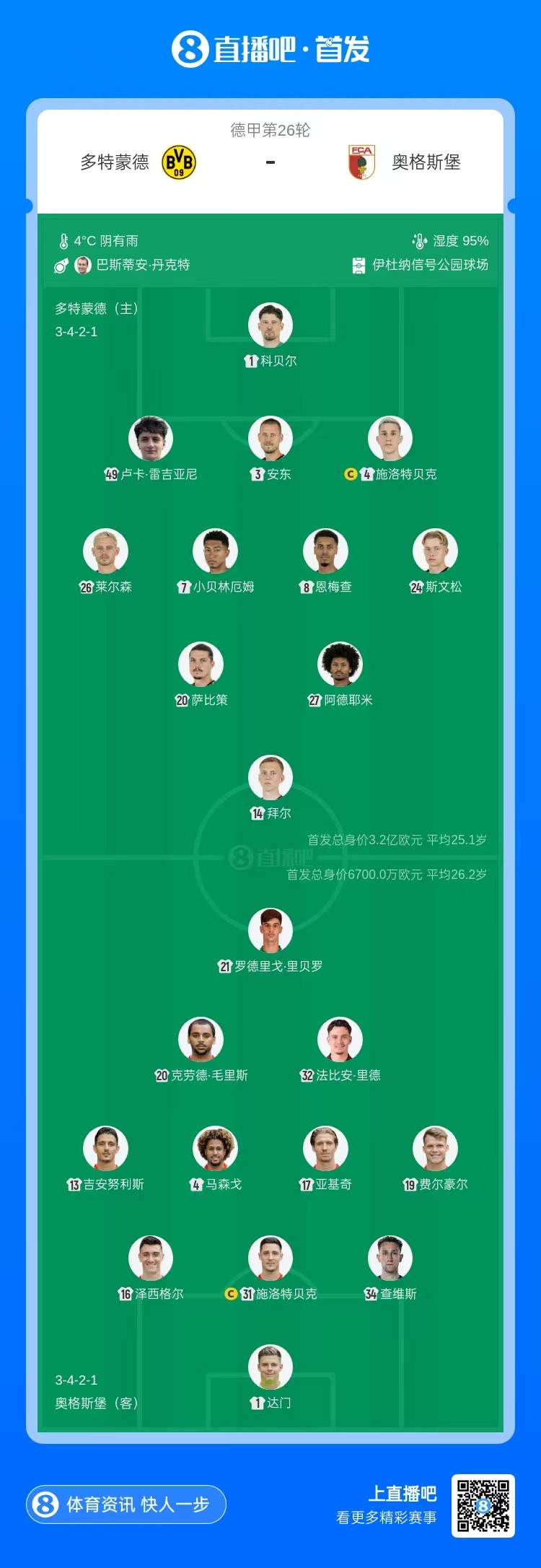 多特vs奥格斯堡首发:阿德耶米、恩梅查先发,萨比策、小贝林出战