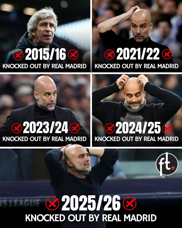 曼城在欧冠淘汰赛与皇马交手7次,被淘汰5次。