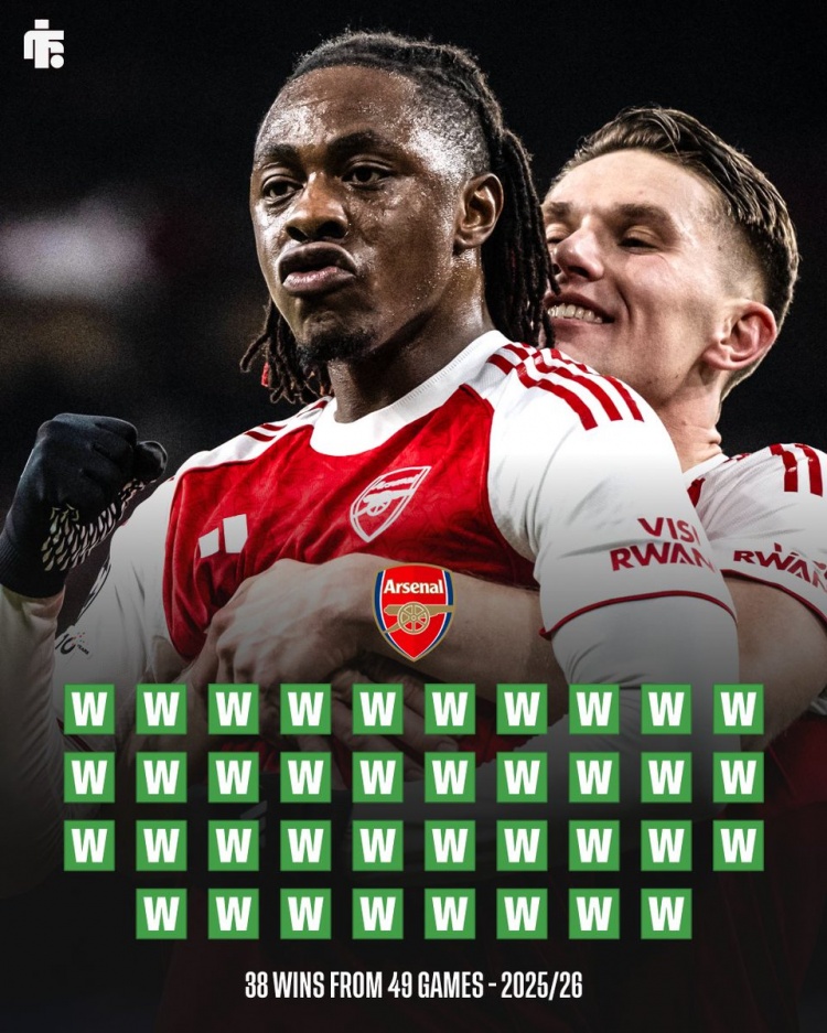 本赛季,阿森纳各项赛事49场比赛已经取得了38场胜利,比2003-04赛季的不败赛季取胜场次还要多1场。
