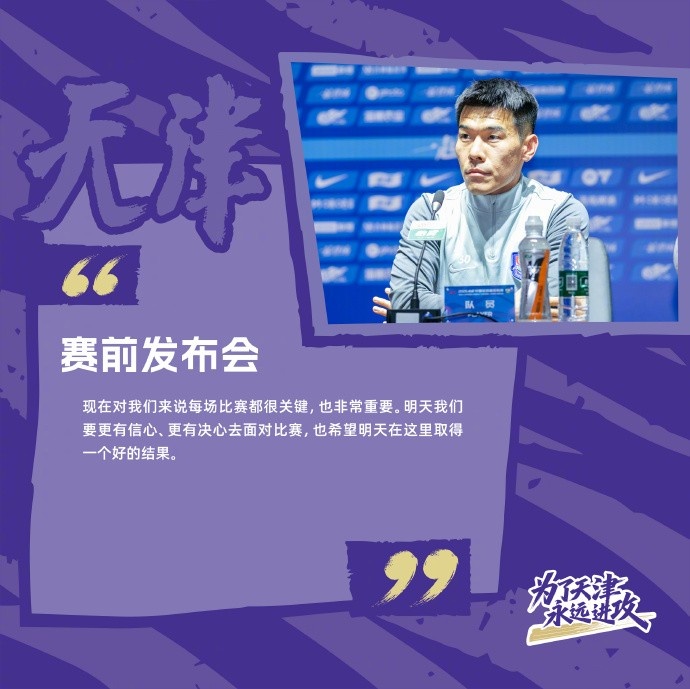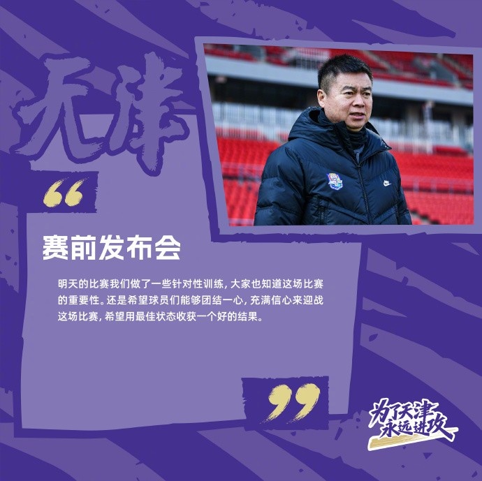 于根伟:明天的比赛我们做了一些针对性训练,大家也知道这场比赛的重要性。还是希望球员们能够团结一心,充满信心来迎战这场比赛,希望用最佳状态收获一个好的结果。