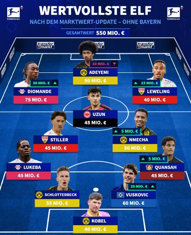德甲无拜仁球员最贵阵:多特4人 宽萨、迪奥曼德、武什科维奇在列