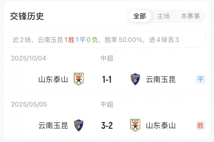 在上赛季的两轮交手中,泰山首回合客场2-3遭玉昆让二追三,次回合主场1-1战平。算上本场比赛,泰山面对玉昆1平2负已3场不胜。