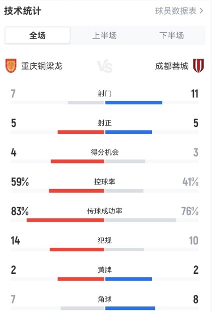 控球率方面,重庆铜梁龙为59%,成都蓉城为41%。射门次数方面,成都蓉城11比7占优,双方各有5次射正。重庆铜梁龙传球成功率为83%,成都蓉城传球成功率为76%。