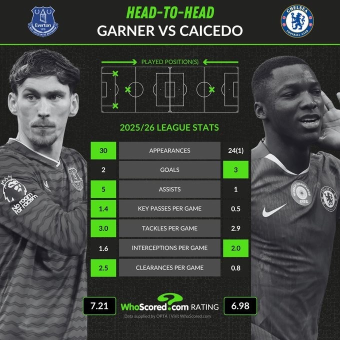 3月22日讯 今天凌晨,埃弗顿在英超主场3-0完胜切尔西,赛后WhoScored对比了两队中场詹姆斯·加纳和凯塞多本赛季的联赛数据。