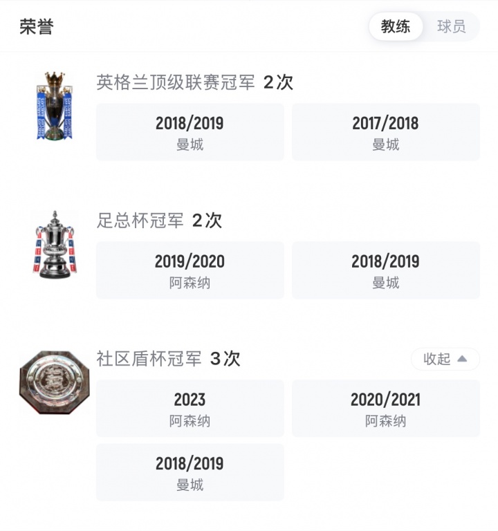 阿尔特塔教练生涯荣誉,包含曼城助教时期以及阿森纳主帅时期