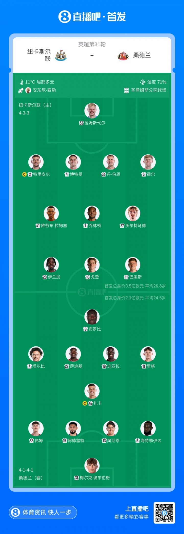 纽卡首发:32-拉姆斯代尔、2-特里皮尔、3-刘易斯·霍尔、4-博特曼、33-丹-伯恩、7-乔林顿、41-雅各布·拉姆塞、10-戈登、11-巴恩斯、20-伊兰加、27-沃尔特马德