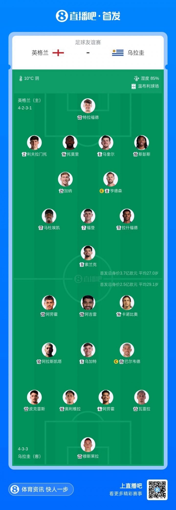 03月28日讯 友谊赛英格兰对阵乌拉圭,赛前首发公布。