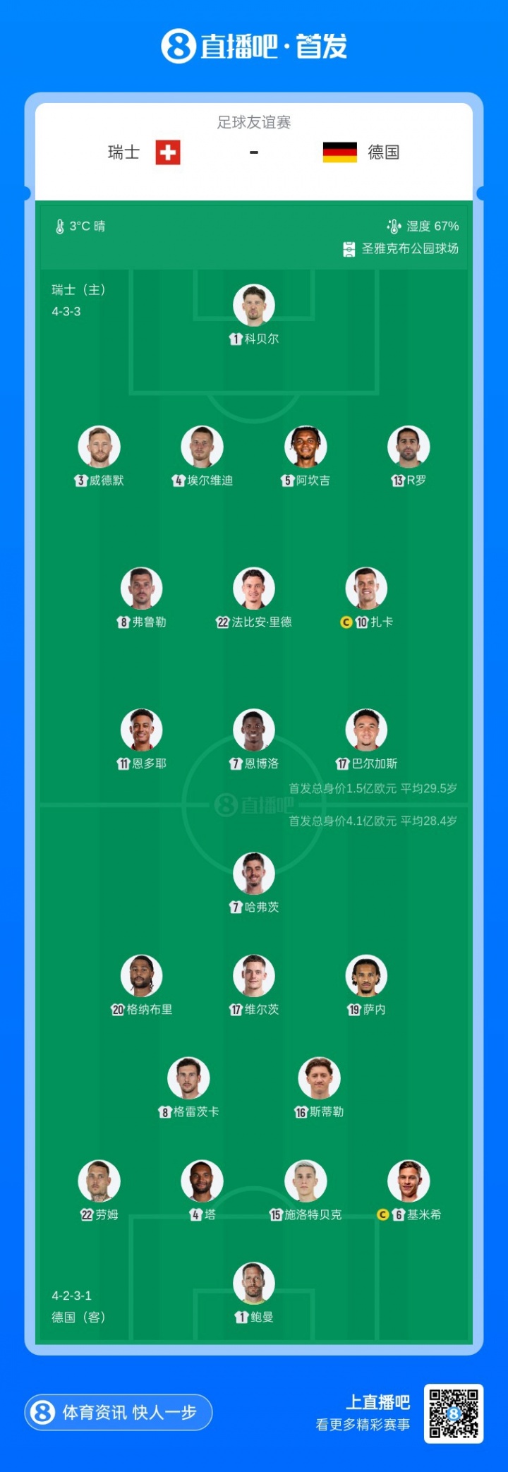 03月28日讯 友谊赛瑞士对阵德国,赛前首发公布。
