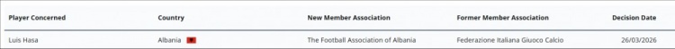 3月28日讯 官方消息,那不勒斯外租中场哈萨将会籍从意大利改为阿尔巴尼亚。