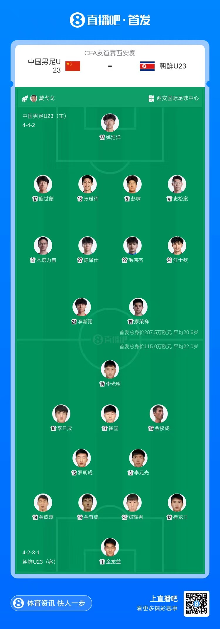 国足U23vs朝鲜U23首发:姚浩洋、毛伟杰先发,陈泽仕、彭啸出战