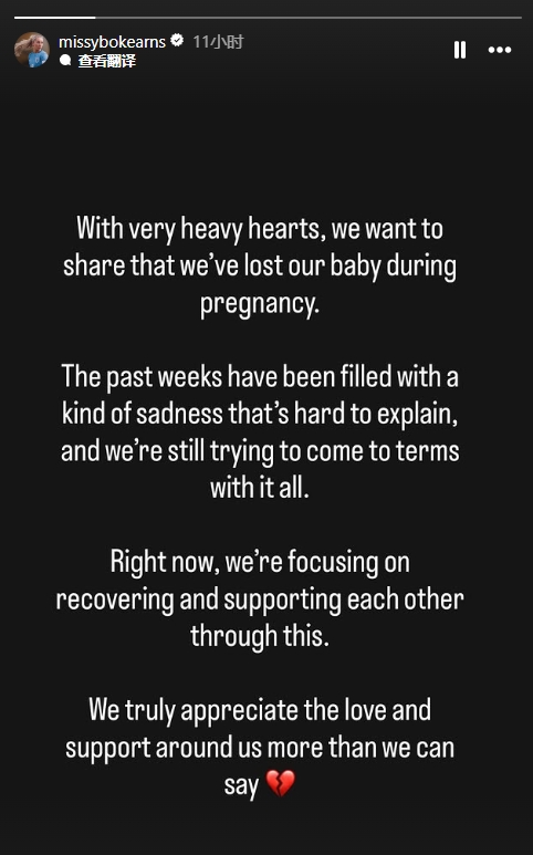 但遗憾的是,科恩斯今天在社媒宣布了这个不幸的消息:怀着沉重的心情,我们想告诉大家,在怀孕期间我们失去了我们的宝宝。过去几周充满了难以言喻的悲伤,我们还在努力接受这一切。目前我们正在努力恢复并相互支持度过这段时期。真心感谢身边人给予的爱与支持。