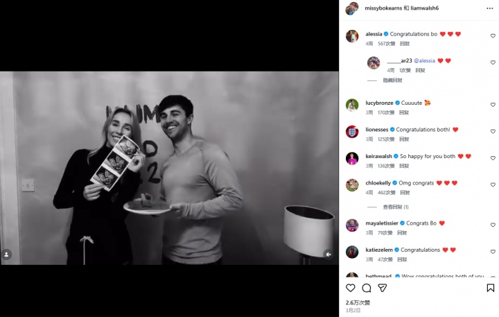 科恩斯与沃尔什在社媒宣布怀孕消息