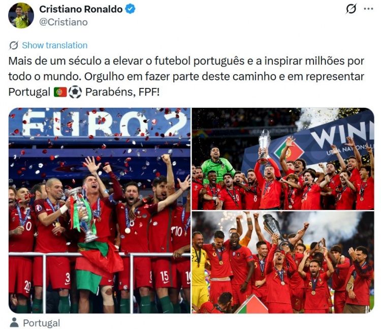 葡萄牙传奇球星C罗今日社媒发文,晒出球队的三座大赛冠军(欧洲杯1个+欧国联2个),这位41岁的老将写道:“一个多世纪以来,不断提高葡萄牙足球,并激励全球数百万球迷。能投身这条征程,身披葡萄牙战袍为国出征,我倍感自豪