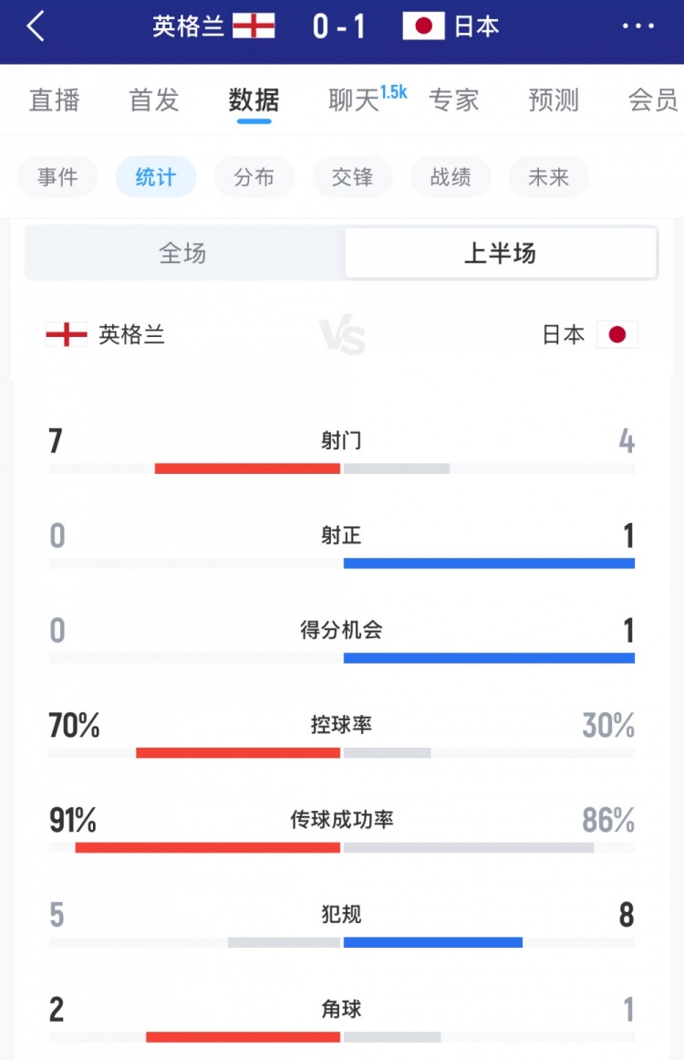 英格兰vs日本半场数据:射门数7-4,射正数0-1,控球率七三开