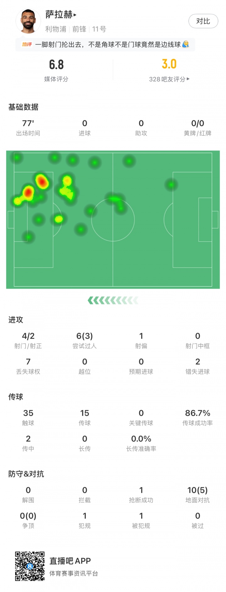 萨拉赫第77分钟被换下场!全场1失单刀+1失点