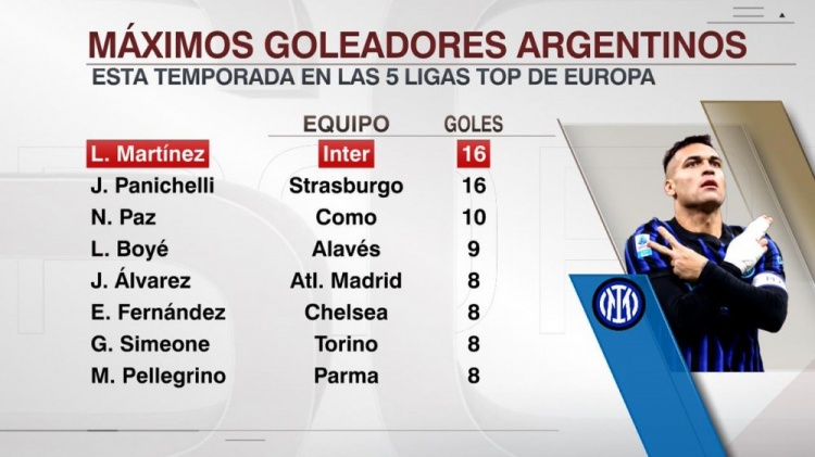 据ESPN统计,劳塔罗本赛季意甲打进16球,与帕尼切利并列五大联赛阿根廷球员最多。
