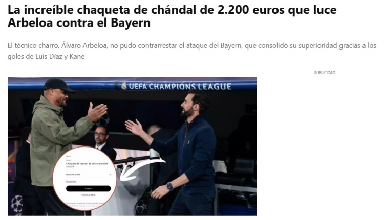 4月8日讯 据《每日体育报》报道,在欧冠1/4决赛首回合,皇马1-2不敌拜仁的比赛中,皇马主帅阿韦洛亚的着装引发人们关注,他身穿的路易威登(Louis Vuitton)运动夹克市场售价达到2200欧元(人民币17621.56元)。