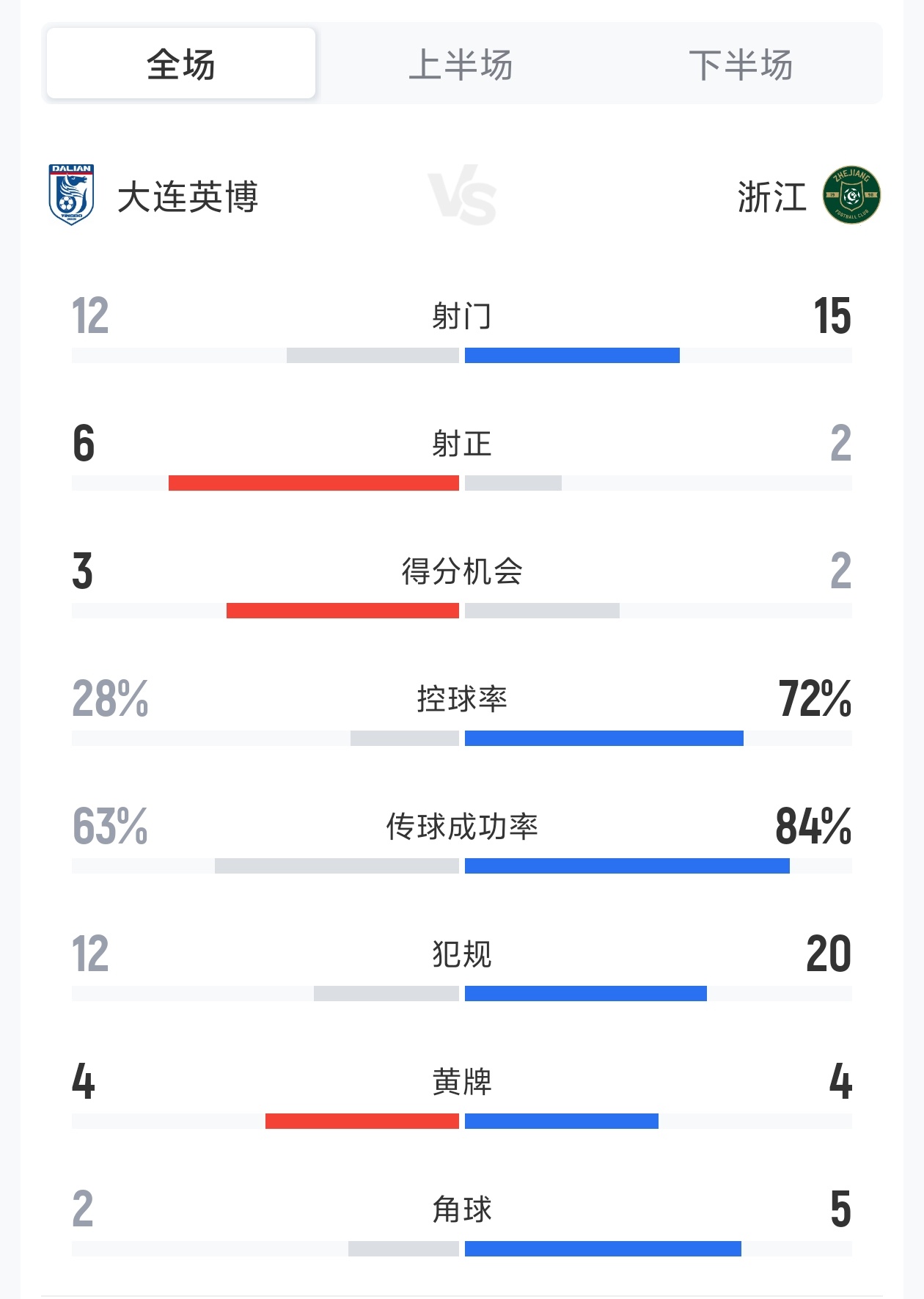 04月10日讯 中超第5轮,大连英博3-0战胜浙江,以下为双方全场数据对比: