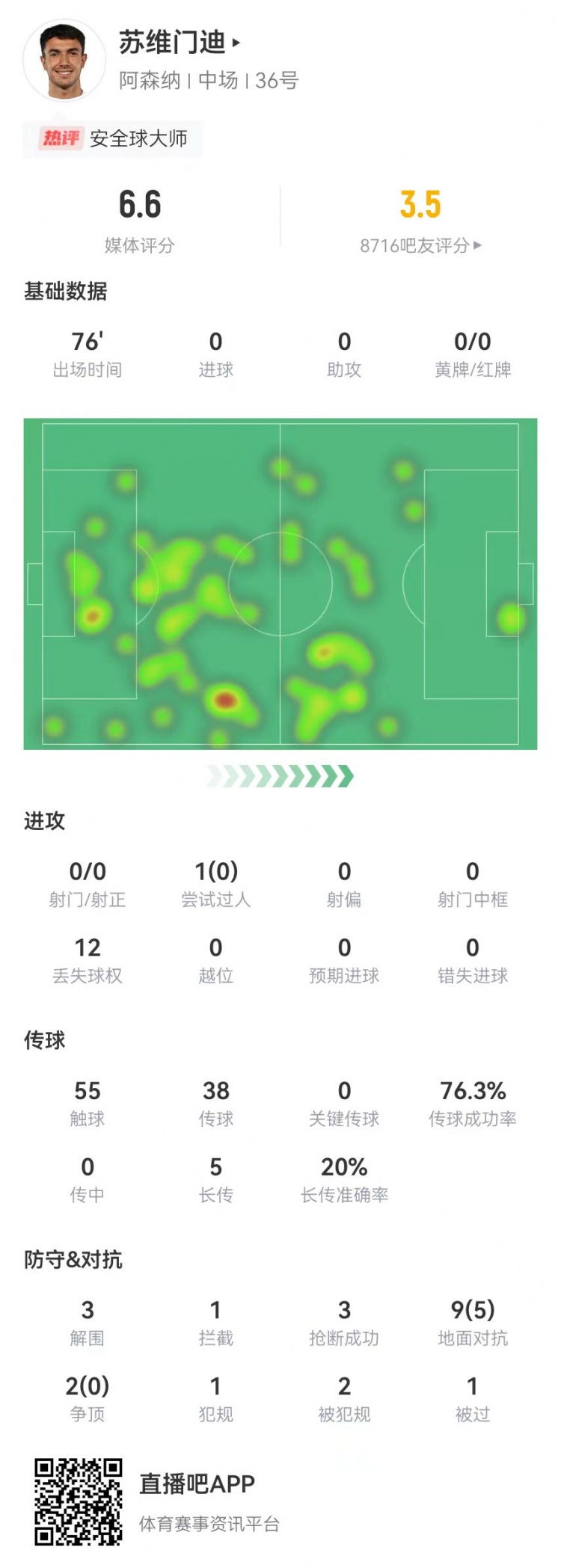 4月11日讯 阿森纳在本轮英超对阵伯恩茅斯,苏维门迪本场数据如下:
