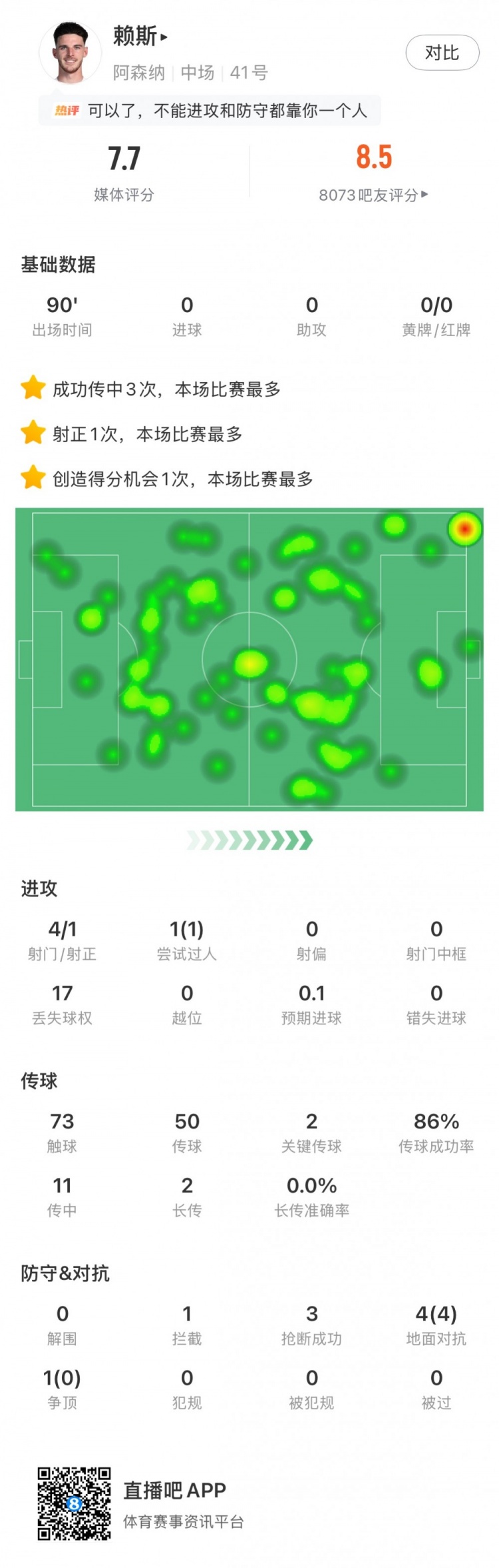 触球73次,传球50次,传球成功率86%