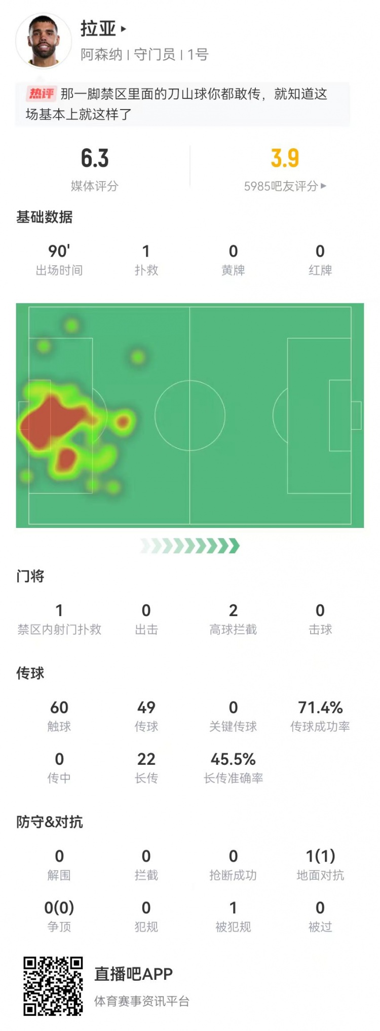 拉亚本场1扑救+2高球拦截 22长传、10次成功 仅获评6.3分