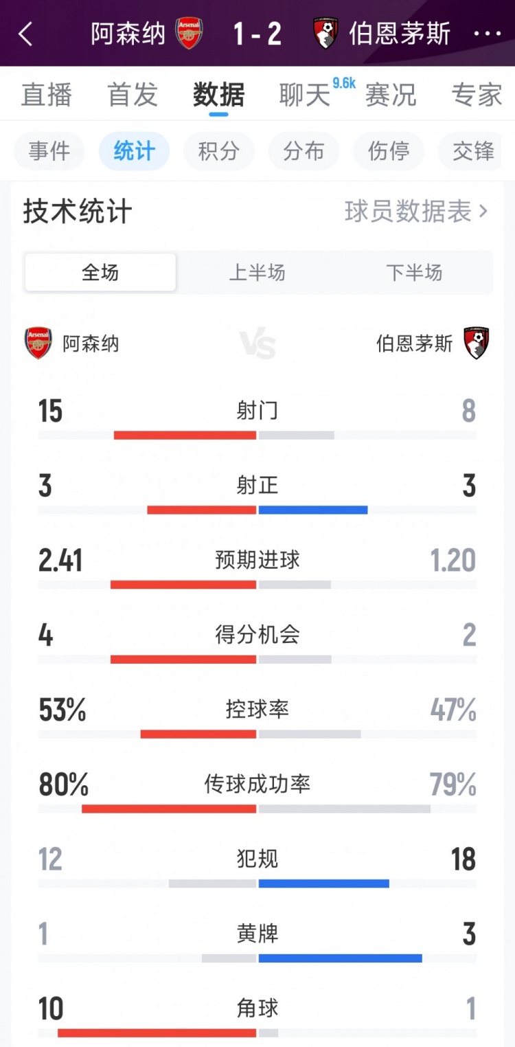 4月11日讯 在本轮英超,阿森纳主场1-2不敌伯恩茅斯,以下为双方全场数据对比: