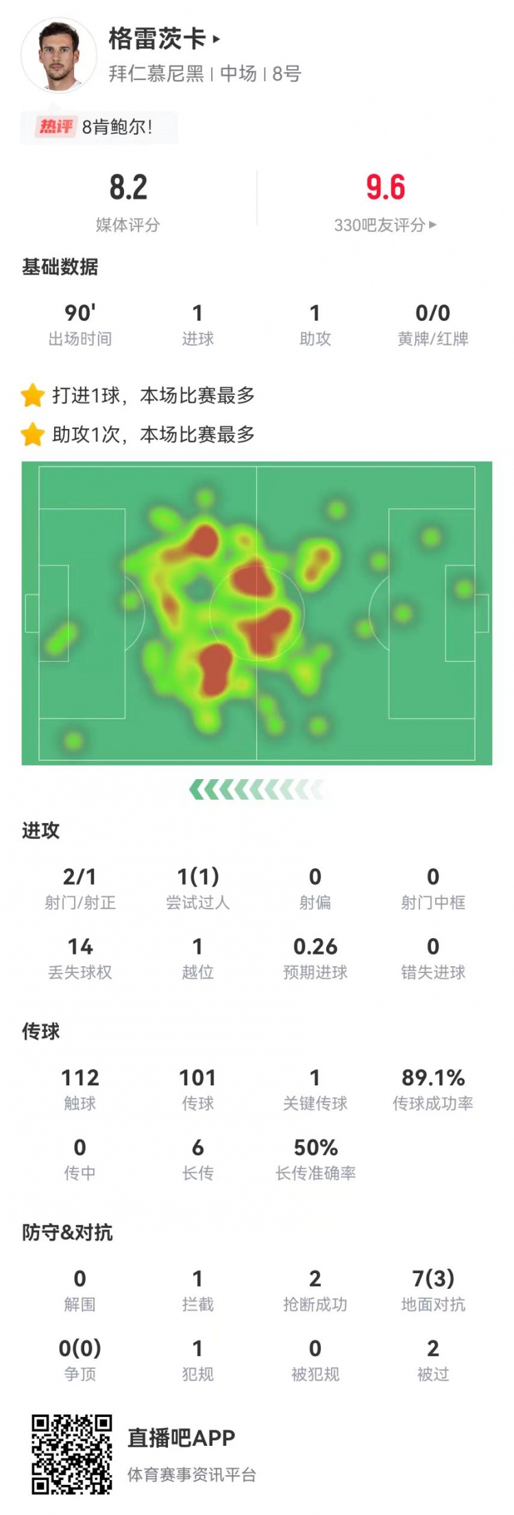 4月12日讯 拜仁在本轮德甲5-0大胜圣保利,格雷茨卡本场数据如下: