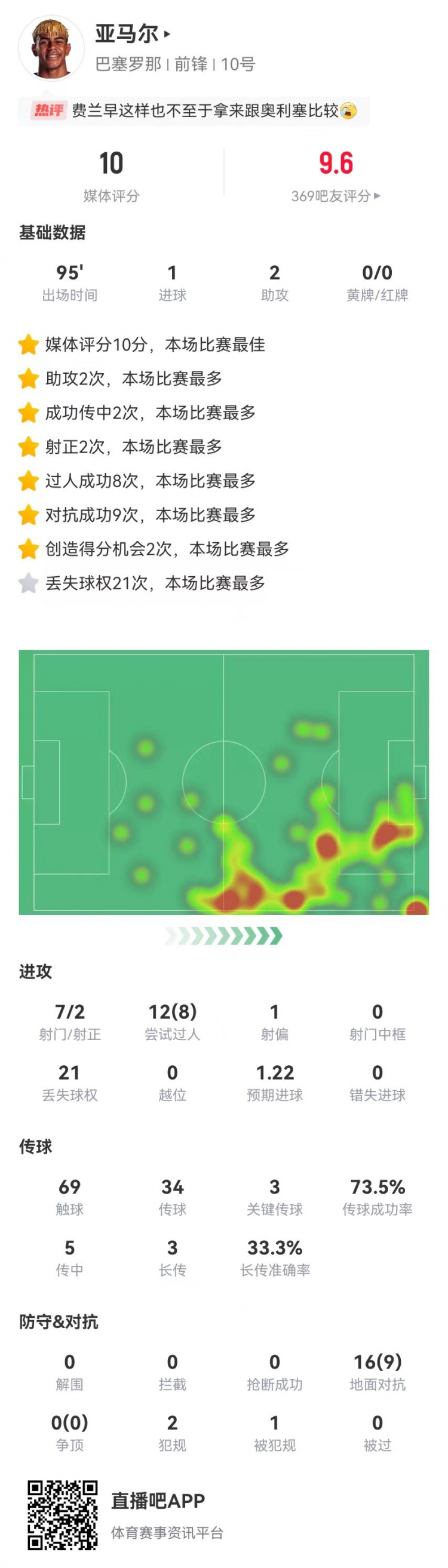 4月12日讯 巴萨在本轮西甲对阵西班牙人,亚马尔本场数据如下: